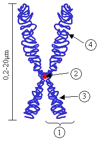 (1) Chromatide. Chacune formée d'un brin d'ADN parental et d'un brin d'ADN néoformé obtenu après réplication durant la phase S ; (2) Centromère. Le point de contact des deux chromatides, et le point de séparation lors de la mitose ; (3) Bras court ; (4) Bras long.