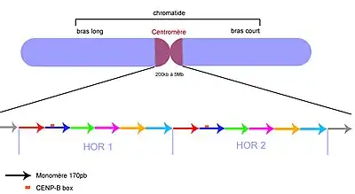 Chez l’homme, l’ADN répété centromérique est principalement de l’ADN α-satellite (aussi appelé alphoid DNA en anglais), dont le motif unitaire (monomère) fait 171 pb[6]. Ces monomères sont organisés en motifs répétés d’ordre supérieur (higher order repeat ou HOR), alignés de manière ininterrompue dans la même orientation sur des distances allant de 100 kb à 4 Mb. Au sein d’un même chromosome, les HOR sont très homogènes, avec 99,8 % d’identité de séquence, alors que les monomères au sein d’un HOR ne partagent qu’entre 60 et 80 % d’identité. L’ADN α-satellite contient une séquence particulière, la boîte CENP-B (CENP-B Box), de 17 pb, capable de lier la protéine CENP-B et impliquée dans la formation de la chromatine centromérique et l’assemblage du kinétochore.