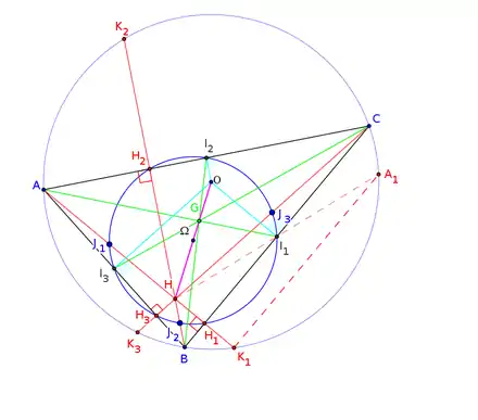 - les milieux des segments joignant les centres des cercles exinscrits au triangle ;