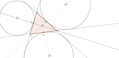 On appelle mittenpunkt du triangle ABC le point de concours des droites reliant les centres OA, OB, OC des trois cercles exinscrits aux milieux respectifs des côtés du triangle.