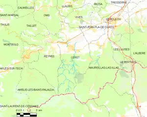 Céret se situe à l'entrée du Vallespir et de la haute-vallée du Tech. La ville est traversée par la route départementale 115, ancienne route nationale 115, qui relie Le Boulou à l'Espagne par le col d'Ares en suivant le cours du Tech jusqu'à Prats-de-Mollo. Depuis juin 2010 et la mise en service de la déviation ouest du Boulou sur la route départementale 900 (ancienne route nationale 9), elle complète l'accès routier à Céret depuis la plaine roussillonnaise et notamment depuis Perpignan. Le conseil général a pour projet de relier cette déviation à Céret par une route à une fois deux voies, déviant ainsi Saint-Jean-Pla-de-Corts[28] et aboutissant sur la route départementale 618, après le franchissement du Tech par un nouveau pont routier prévu vers 2025.