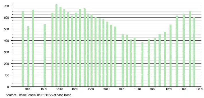 - Dans le tableau des recensements et le graphique, par convention dans Wikipédia, le principe a été retenu, pour les populations légales postérieures à 1999 de n’afficher dans le tableau des recensements et le graphique que les populations correspondant à l'année 2006, première population légale publiée calculée conformément aux concepts définis dans le décret no 2003-485 du 5 juin 2003, et les années correspondant à une enquête exhaustive de recensement pour les communes de moins de 10 000 habitants, ainsi que la dernière population légale publiée par l’Insee.