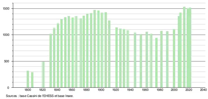 L'évolution du nombre d'habitants est connue à travers les recensements de la population effectués dans la commune depuis 1800. Pour les communes de moins de 10 000 habitants, une enquête de recensement portant sur toute la population est réalisée tous les cinq ans, les populations légales des années intermédiaires étant quant à elles estimées par interpolation ou extrapolation[24]. Pour la commune, le premier recensement exhaustif entrant dans le cadre du nouveau dispositif a été réalisé en 2008[25].