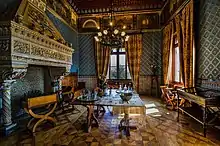 Le mobilier néo-gothique, riche d'influences exotiques, notamment hispano-mauresques et orientales, culmine dans la chambre turque où des centaines de meubles, bijoux, armes, vases, canapés et lampes se profilent sous le lourd rideau du plafond qui simule un rideau entre narguilé et œufs d'autruche.