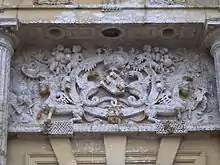 Entièrement construit en pierre, sur un large socle taluté, le corps de logis de plan carré, coiffé de deux grands comble reliés en « H », est cantonné de quatre pavillons quadrangulaires, fortement saillants, dont les hauts toits sont surmontés de quatre statues symbolisant les quatre vertus cardinales[5]. On y accède par un large perron menant à une porte basse surmontée d'un grand tableau sculpté et au-dessus les trois ordres classiques et une lucarne coiffée d'un petit dôme et d'un guerrier en plomb.