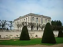 La cour d'honneur, bordée de terrasses plantées de tilleuls, est traitée sobrement : Duchêne supprime les massifs et crée une transition entre les terrasses et la cour par des plates-bandes dont les graviers de brique et d'ardoise dessinent une frise de postes.