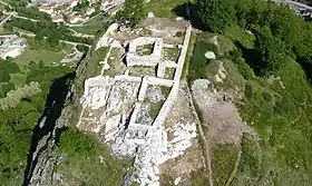 Le site archéologique découvert a une surface totale de plus de 8 000 m2, pour plus de 150 m de longueur entre ses deux extrémités les plus éloignées (nord-ouest / sud-est) ; sa forme générale (enceinte extérieure) est celle d'un parallélogramme allongé[3]. Deux tours flanquent l'enceinte (fig. 16)[3]. La tour du Barri, dont il subsiste un pan à l'extrémité nord-ouest de la forteresse et de la plateforme, domine le bassin d'Auzat. La tour du Campanal, à l'extrémité sud-est du site, garde le point d'accès à l'espace intérieur des fortifications.