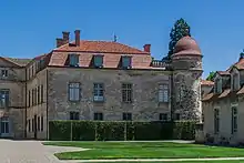 Le château comporte trois niveaux ; le troisième niveau est en partie remplacé sur les ailes par des combles à la Mansart. La couverture est en tuiles. Au fond de la cour d'honneur, entre les deux ailes qui présentent une avancée importante, la façade comprend trois travées et elle est surmontée d'un fronton. Une tour ronde est accolée à l'extrémité extérieure de chacune des ailes.