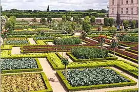 d’espèces. D'un style purement Renaissance, il se compose de neuf carrés bordés d’arbres fruitiers en cordons et plantés de légumes aux couleurs harmonieusement agencées où s'associent dans l’esprit des jardins italiens du XIVe siècle, des éléments décoratifs, fontaines, tonnelles et carrés de fleurs, savamment disposés pour distraire les promeneurs[44], en transformant ainsi le jardin utilitaire en un jardin d’agrément[3].