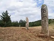 Un des menhirs du site de la Cham des Bondons. À l'arrière-plan, le puech de Mariette. | ||||