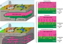 Une chambre magmatique (moins courant, une poche magmatique) est, dans la lithosphère, une zone souterraine de quelques dizaines à plusieurs centaines de kilomètres cubes en moyenne[2],[3], qui contient du magma plus ou moins chaud. Ce magma provient de la fusion partielle de roches plus profondes et alimente la chambre par un ou plusieurs conduits. Le magma dans la chambre magmatique peut rester stationnaire à l'interface de la croûte ductile /croûte fragile, créant des plutons granitiques par le biais d'injections filoniennes, ou remonter rapidement en surface et donner naissance à des volcans, effusifs, explosifs, de type stromboliens ou à une caldeira.
