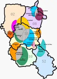 Champagne FM est présente dans la quasi-totalité de la région Champagne-Ardenne, et dans le sud du département de l'Aisne, en desservant en particulier les agglomérations suivantes : Chalons-en-Champagne, Charleville-Mézières, Château-Thierry, Epernay, Fismes, Joinville, Reims, Rethel, Romilly-sur-Seine, Saint-Dizier, Sainte-Menehould, Sedan, Troyes, Vitry-le-François et Vouziers.