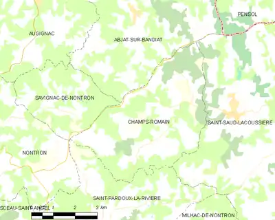 Champs-Romain est limitrophe de quatre autres communes. À l'ouest, le territoire de Nontron est distant d'environ 25 mètres.