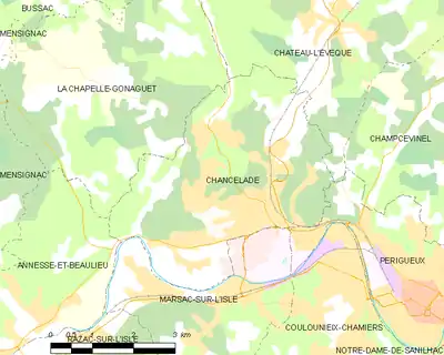 Chancelade est limitrophe de cinq autres communes. À l'est, le territoire de Coulounieix-Chamiers est distant d'environ 170 mètres et au nord-est, celui de Champcevinel est éloigné de moins de 300 mètres.
