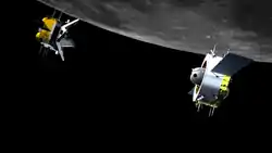 En préparation de l'amarrage avec le module de remontée, l'orbiteur largue l'adaptateur avec l'atterrisseur devenu inutile le à 19h46 UTC[59]. Le module de remontée décolle de la surface lunaire le à 15h10 UTC, s'insérant 6 minutes plus tard en orbite autour de la Lune à l'aide de son moteur principal de 3 000 newtons, l'atterrisseur lui ayant servi de table de lancement. C'est le premier décollage depuis un autre corps céleste que la Terre pour une mission spatiale chinoise. La lumière de la Lune empêchant le module de remontée de se repérer à l'aide de ses viseurs d'étoiles, il utilise ses capteurs internes afin de déterminer sa position et son attitude, avec le soutien de la télémesure du contrôle au sol[60]. Son orbite initiale est de 15 × 180 kilomètres autour de la Lune[38]. Le rendez-vous spatial entre l'orbiteur et le module de remontée se déroule en quatre phases, rapprochant successivement les deux modules à 50 kilomètres, 5 kilomètres, 1 kilomètre puis 100 mètres l'un de l'autre. L'amarrage est rendu difficile par la différence de masse entre les deux modules, l'orbiteur pesant encore 2,3 tonnes contre seulement 400 kilogrammes pour le module de remontée. C'est le premier rendez-vous et amarrage automatique en orbite d'un autre corps céleste que la Terre de l'histoire[61]. Le module de remontée s'amarre finalement à l'orbiteur le à 21h42 UTC. Le conteneur des échantillons est transféré dans la capsule de retour à 22h12 UTC[62].