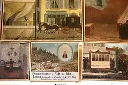 On distingue trois catégories d'ex-votos. Les plus nombreux sont les plaques de marbre, on en dénombre environ 650. La seconde catégorie comprend environ une centaine d'ex-votos divers contenant du texte encadré et comportant un élément éventuel d’ornementation (bouquets de fleurs séchées, tapisseries, cheveux, photographies, etc.). La troisième catégorie est celle des tableaux ou tableautins (compte tenu de leurs dimensions généralement modestes). Ces tableaux peuvent être subdivisés en deux types : d’une part ceux qui sont une représentation générale de la Vierge, du Christ, ou de saints, et d’autre part ceux qui représentent un événement précis que le donateur a voulu perpétuer en peignant, dessinant lui-même ou en confiant à un artisan ou artiste professionnel la réalisation du tableau. C’est, sans doute, la forme d’ex-voto la plus intéressante, car au témoignage de la foi s'ajoute un témoignage sur la vie de nos ancêtres, leur habitat, leurs moyens de transport, leur habillement, etc. Ils ne représentent toutefois ici qu’environ 75 ex-votos sur un total de près de 900.