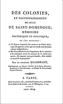 En juillet, craignant une nouvelle expédition à Saint-Domingue, Malenfant veut dissuader la Première Restauration et écrit au mois d' un exposé de 334 pages en toute hâte :