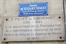 Pictet est rappelé en mars 1814 à Genève, où il devient dès lors le diplomate attitré de la cité, puis de la Confédération, durant les grands congrès internationaux qui redessinent la carte de l'Europe post-napoléonienne. Pictet part d'abord pour Paris avec pour mission de réunir les territoires de Genève, qui va devenir canton suisse, enclavés en France et en Savoie, et d'assurer leur continuité avec la Suisse. Il faudra plus de deux ans de négociation pour y parvenir. Représentant de Genève au premier congrès de Paris (1814) et au congrès de Vienne (1814-1815), il sera l'envoyé de la Confédération au second congrès de Paris et à Turin (1816). Il obtiendra la cession de communes dans le Pays de Gex, assurant ainsi la continuité du nouveau canton de Genève avec la Suisse, et de communes en Savoie sarde, de façon que le territoire soit d'un seul tenant. Cette obtention de territoire est d'abord acquise grâce à l'article 4 au premier Traité de Paris et les articles 79[15] et 80[16] de l'Acte final du Congrès de Vienne. Cette réunion de nouveaux territoires a lieu malgré la résistance de la France, représentée par Talleyrand au premier congrès de Paris et au Congrès de Vienne puis par le duc de Richelieu au second congrès de Paris dont Pictet de Rochemont est l'ami. Les alliés étaient convenus, à Vienne de reconnaître la neutralité de la Suisse, Pictet rédigera la déclaration solennelle du 20 novembre 1815 par laquelle les Puissances reconnaissent que "la neutralité permanente de la Suisse et de son indépendance de toute influence étrangère sont dans les vrais intérêts politiques de l'Europe entière"[17]. Par le Traité de Turin, cette neutralité avait été étendue à la Savoie du Nord, clause abolie en 1918.