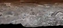 Les observations faites par la sonde New Horizons en montrent que la surface de Charon, densément cratérisée, est vieille d'au moins quatre milliards d'années. Mais il y a eu vers cette époque une activité intense[15] : des coulées de glace d'ammoniac, de vastes plaines inondées de glace d'eau dans l'hémisphère sud, une ceinture de canyons jusqu'à cinq fois plus profonds que le Grand Canyon du Colorado, et au pôle nord une calotte rouge qui pourrait être constituée de méthane et d'azote (la couleur rouge serait due à des sous-produits d'hydrocarbures), dénommée Mordor[16].