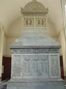 Le mausolée en marbre blanc de la chapelle sépulcrale, édifié sur le caveau où sont réunis les ossements des émigrés fusillés en 1795, porte l'inscription en latin : "QUIBERON XXI JULH MDCCXCXV W PRO DEO, PRO REGE NEFARIE TRUCIDATI"("Quiberon le 21 juillet 1795, indignement immolés pour Dieu et pour le Roi"). Sur les trois côtés du soubassement, on lit les noms de 952 victimes.