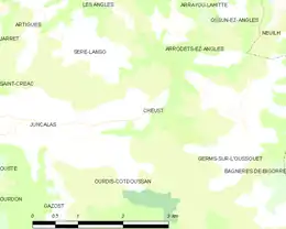 Cheust est limitrophe de six autres communes dont Gazost au sud par un simple quadripoint à la Fontaine de Chou.