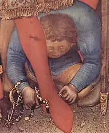 Les éperons, connus depuis longtemps, se révèlent particulièrement cruels durant la période médiévale, ils consistent la plupart du temps en une longue tige pointue, conçue pour piquer le flanc du cheval et dont l'utilisation donne lieu à des expressions populaires telles que « chevaucher à pointe d'éperon »[126]. Ces éperons pointus sont notamment représentés sur la tapisserie de Bayeux. Vers le milieu du XIVe siècle, les éperons à molette, qui consistent en une tige au bout de laquelle est fixée une roulette dentelée et acérée, font leur apparition. En tournant sur son axe, la roulette crantée peut entrer superficiellement dans la peau du cheval, et le blesser légèrement[127].