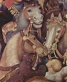Durant le bas Moyen Âge (1300-1550), les grandes batailles deviennent plus courantes, probablement en raison de la réussite des tactiques d'infanterie et de la modernisation de l'armement médiéval[51]. Ces techniques nécessitent pour le cavalier de mettre pied à terre et le rôle du cheval de guerre change lui aussi. Au XVIIe, les chevaux de charge médiévaux appartiennent au passé et sont remplacés par des chevaux légers sans armure. Tout au long de cette période, les chevau-légers, ou prickers, sont utilisés pour le pistage et la reconnaissance[48]. Des chevaux de trait, ou des bœufs, sont utilisés pour tirer les premiers canons lourds[52]. D’autres chevaux tirent les wagons et transportent des fournitures pour les armées.
