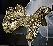 La selle rigide autorise une utilisation plus efficace de l'étrier[12]. Il est développé en Chine, et largement utilisé dans ce pays en 477 de l’ère chrétienne[115]. Au VIIe siècle, principalement en raison des invasions venues d'Asie centrale, comme celle des Avars, les étriers arrivent en Europe[116]. Les cavaliers européens les adoptent vraisemblablement au cours du VIIIe siècle[117]. Leur adoption est lente. La plus ancienne source iconographique représentant l'étrier remonte à un manuscrit de la fin du IXe siècle, conservé à l'abbaye de Saint-Gall[118].