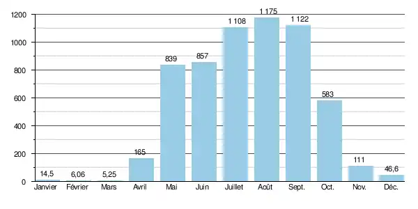 Le débit moyen mensuel observé en mars (minimum d'étiage) est de 5,25 m3/s, soit moins de 0,5 % du débit moyen du mois d'août (1 175 m3/s), ce qui souligne l'amplitude extrêmement élevée des variations saisonnières. Sur la durée d'observation de 50 ans, le débit mensuel minimal a été de 0,89 m3/s en , tandis que le débit mensuel maximal s'élevait à 4 060 m3/s en .