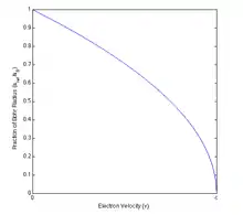 À droite, le rapport ci-dessus des rayons de Bohr relativiste et non-relativiste a été tracé en fonction de la vitesse de l’électron. On remarque que le modèle relativiste montre que le rayon diminue lorsque la vitesse augmente.