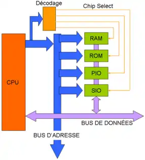Le bus d'adresse est donc décodé pour contrôler la ligne chip select des puces qui y sont reliées. Il y a plusieurs façons de décoder les adresses.