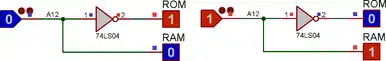 Dans l'exemple précédent, on remarque que le bit A12 est discrimant. On peut donc tout simplement l'utiliser pour partiellement décoder l'adresse : on économisera des circuits. Mais, par exemple, l'adresse 0xFxxx sélectionnera la RAM, alors que ce n'est pas son adresse. On a donc créé des zones images de la RAM et de la ROM.