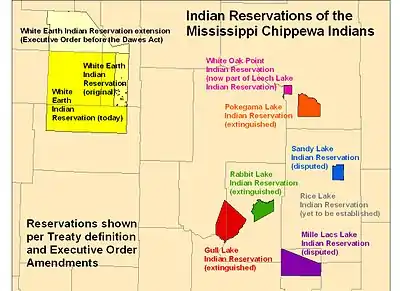 Tous les autres Chippewa furent expulsés de force par l'armée des colons, de leurs réserves vers la zone entourant les réserves du lac Leech et du lac Winnibigoshish. En raison de conflits entre les Chippewas du Mississippi et les « Pillagers » du lac Leech et les groupes du lac Winnibigoshish, les Chippewas négocièrent avec le gouvernement américain une réinstallation. La tribu de Pokegama Lake, ainsi que les quelques tribus nomades de Sandy Lake, négocièrent pour rester dans la région et formèrent la tribu de « White Oak Point » sur la réserve de White Oak Point. En 1934, elle fusionna avec les réserves indiennes de Cass Lake, (Chippewa), Lake Winnibigoshish et Leech Lake pour former la tribu contemporaine Ojibwe de Leech Lake et sa réserve.