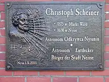 Christoph Scheiner, né le à Markt Wald près de Mindelheim en Souabe bavaroise[2] et mort le à Neisse en Silésie, est un prêtre jésuite allemand, astronome et mathématicien à l'université d'Ingolstadt, pionnier de l'optique instrumentale et codécouvreur des taches solaires.