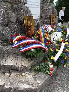 Épitaphe : « Soldats roumains, loin de votre patrie pour laquelle vous vous êtes sacrifiés, reposez en paix, auréolés de gloire, dans cette terre qui ne vous est pas étrangère; Marie, Reine de Roumanie. »