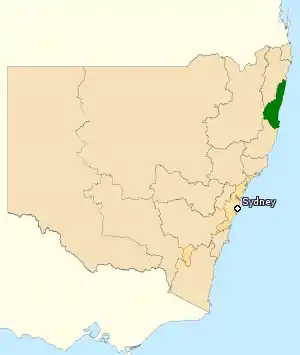 La circonscription de Cowper (en vert) au nord de la Nouvelle-Galles du Sud.