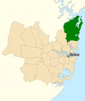 La circonscription de Mackellar (en vert) au nord de Sydney en Nouvelle-Galles du Sud.