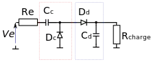Lorsque la tension d'entrée est négative, le courant passe dans la diode Dc et charge le condensateur Cc. Quand la tension redevient positive, la diode est bloquée et le circuit de détection ajoute la valeur de la crête supérieure à celle de la crête inférieure restée dans Cc[9].