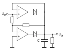 Quand le signal n'est pas symétrique, et qu'on veut en extraire la valeur de crête à crête, il faut redresser les deux alternances. Cela peut s'effectuer, soit par un circuit à diodes, soit par un circuit à amplificateurs opérationnels.