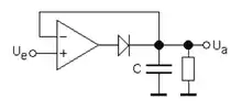 L'amplificateur opérationnel bouclé sur lui-même compense la différence entre ses deux bornes d'entrée (+ et -). En anglais ce montage est dénommé peak detector[8].
