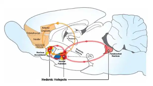 - la composante affective des renforcements dépend d'un nombre limité de petites structures, appelées « hotspots » ou « points chauds », d'un volume d'environ 1 cm3, et localisées dans le noyau parabrachial, le noyau accumbens et le pallidum ventral[9],[10]. Ces trois structures ou « hotspots » sont interconnectées entre elles et intégrées dans le système des « récompenses / renforcements »[8] (voir figure ci-dessous) ;