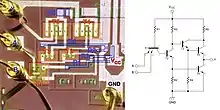 † Remarque : on trouve deux ou trois jonctions P-N en série (dont deux appartenant à l'amplificateur) entre le point [c] et la masse (GND) et une seule jonction P-N entre le point [c] et chaque entrée. Ces jonctions P-N présentant des tensions de seuil relativement faibles, cette configuration limite fortement la tension de basculement de la porte logique et, par conséquent, les tensions qui définissent les états logiques (état bas au-dessous de 0,8 V, état haut au-dessus de 2 V). Par ailleurs, l'application d'un niveau logique haut sur une entrée entraînant le blocage de la jonction P-N qui y est reliée, le courant d'entrée (statique) à l'état haut est quasiment nul (< 50 µA).