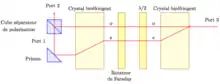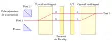 - Du port 1 vers le port 3: Le faisceau incident rencontre le premier cristal biréfringent et se sépare en deux composantes, l'une ordinaire, l'autre extraordinaire, mais parallèles entre elles. Le passage dans le rotateur de Faraday couplé à la lame demi-onde a pour effet de faire tourner la polarisation d'un angle de 90° dans le sens horaire. La composante qui était ordinaire devient extraordinaire et réciproquement. Le passage dans le second cristal biréfringent permet la recombinaison des deux faisceaux en sortie du circulateur[3].