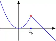 - la limite à gauche et la limite à droite en existent et sont finies et égales.Alors, si n'est pas égal à , x0 est appelée discontinuité apparente. La discontinuité peut être effacée dans le sens où la fonctionest continue en x = x0 ;
