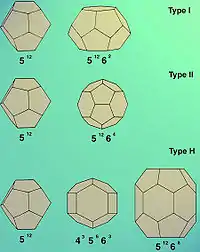la cavité de type 435663 composée de 3 faces carrées, 6 faces pentagonales et 3 faces hexagonales ; elle ne se rencontre que dans la structure H qui nécessite la présence conjointe de deux molécules différentes ; une plus grande (ex. : méthylcyclohexane ou le néohexane) qui occupe les grandes cavités, et d'autres plus petites (ex. : méthane ou sulfure d'hydrogène)[6],[7] occupant les petites et les moyennes cavités ; - structure à grande cavité :