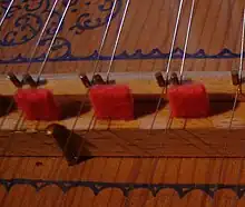 Chaque sillet est rectiligne ou presque ; la longueur des cordes croît de la droite vers la gauche - c'est-à-dire de l'aigu vers le grave - déterminant la forme du chevalet et, grossièrement, celle de l'instrument. Si elles étaient toutes de même diamètre et de même matière, une étendue (usuelle) de 5 octaves impliquerait une longueur excessive de la corde la plus grave[note 7]. Pour l'éviter, on fait varier leur diamètre (de 0,18 mm pour les plus aiguës, à 0,65 mm pour les plus graves, chiffres indicatifs), ainsi, éventuellement, que leur matière (fer pour l'aigu, bronze pour l'intermédiaire, cuivre pour le grave).