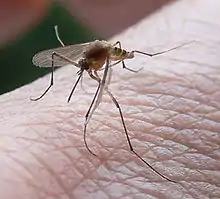 Le climat peut également affecter la santé humaine de façon indirecte à travers les animaux. Le changement climatique provoque l'émergence de nouvelles maladies chez les animaux dont certaines sont transmissibles à l'homme[9]. Accompagné de modifications dans les températures, les précipitations et l'humidité qu'il entraîne, le changement climatique pèse sur le devenir de certaines maladies infectieuses et parasitaires qui affectent l'ensemble du monde vivant. Ce changement perturbe surtout la composition des écosystèmes et les interactions entre espèces. Il intervient donc sur plusieurs aspects des populations d'espèces vectrices et réservoirs et donc sur les virus, bactéries ou parasites pathogènes. D'après plusieurs études scientifiques récentes, les changements de température sont donc responsables de l'extension et même de l'apparition de maladies qui sont transmises par des animaux vecteurs responsables de l'évolution géographique et temporelle de maladies infectieuses et parasitaires. On peut citer comme exemple la malaria (ou paludisme ) qui est sans doute la maladie à transmission vectorielle la plus sensible à un changement climatique. Transmise par des moustiques, cette maladie tue plus d'un million de personnes par an, la population la plus affectée étant les enfants africains de moins de 5 ans[10]. Les pluies abondantes de mousson et la forte humidité sont identifiées comme les facteurs ayant une influence majeure sur la reproduction et la survie de ces moustiques. Il existe également une maladie qui évolue très sensiblement au changement climatique : la Fièvre de la Vallée du Rift[N 4] qui est une maladie qui touche principalement les animaux et peut aussi contaminer l'homme. Elle semble évoluer vers le nord et au-delà de la Méditerranée et de la mer d'Arabie, ce qui pourrait avoir des conséquences très graves et imprévisibles sur la santé humaine. Le changement de climat et surtout le réchauffement climatique sont donc des éléments qui favorisent l'émergence et l'expansion de maladies animales dont certaines sont transmissibles à l'homme.