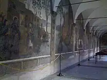 Deux des quatre murs des arcades sont décorés d'un cycle de fresques de l'école Ombrie-Marche d'Antonio Solario et d'aides datant du début du XVIe siècle et représentant des scènes de la Vie de saint Benoît[1]. Au cours de la première moitié du XIXe siècle, les arcades du cloître ont été fermées par des portes vitrées, dans le but de protéger les fresques de Solario.