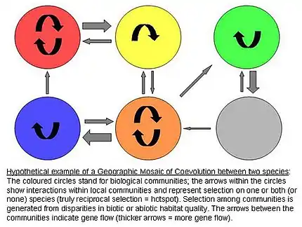 La mosaïque géographique est une approche de l’étude de la coévolution basée sur la différence de sélection de certains traits en fonction des conditions spécifiques des différentes régions où se situent les individus. Elle part du constat de John N. Thompson[5],[6], selon lequel ce sont les interactions écologiques et comportementales entre les individus qui génèrent leur sélection réciproque et qui conduisent à la coévolution.