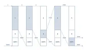 Représentation graphique du processus de codage. Le message codé est « AABA<EOM> » où « <EOM> » représente la fin du message.